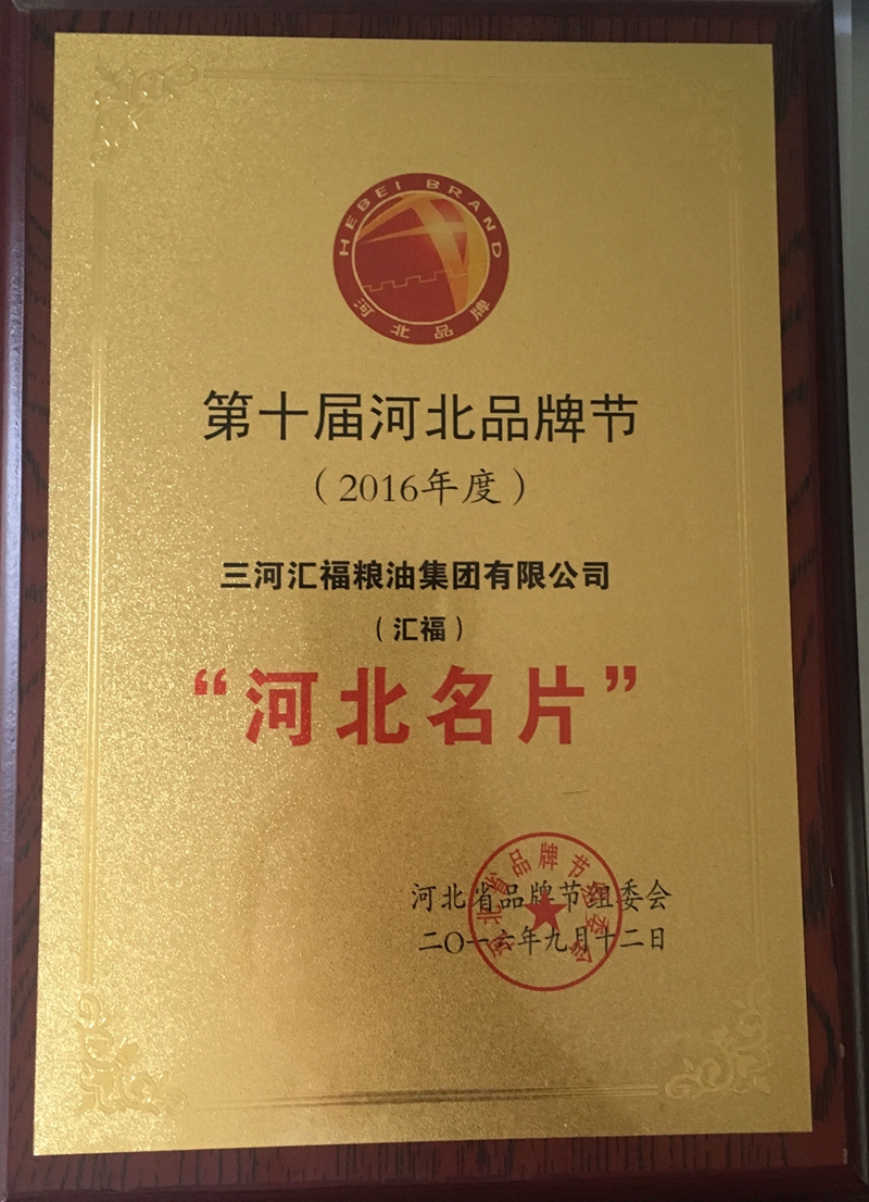 2016年9月12日,由河北省发改委、省质监局等十单位联合举办的第十届河北品牌节暨河北省质量品牌发展大会上,三河汇福粮油集团有限公司荣获“河北名片”荣誉称号;三河汇福粮油集团有限公司董事长石克荣先生被授予“河北品牌建设贡献人物”称号。