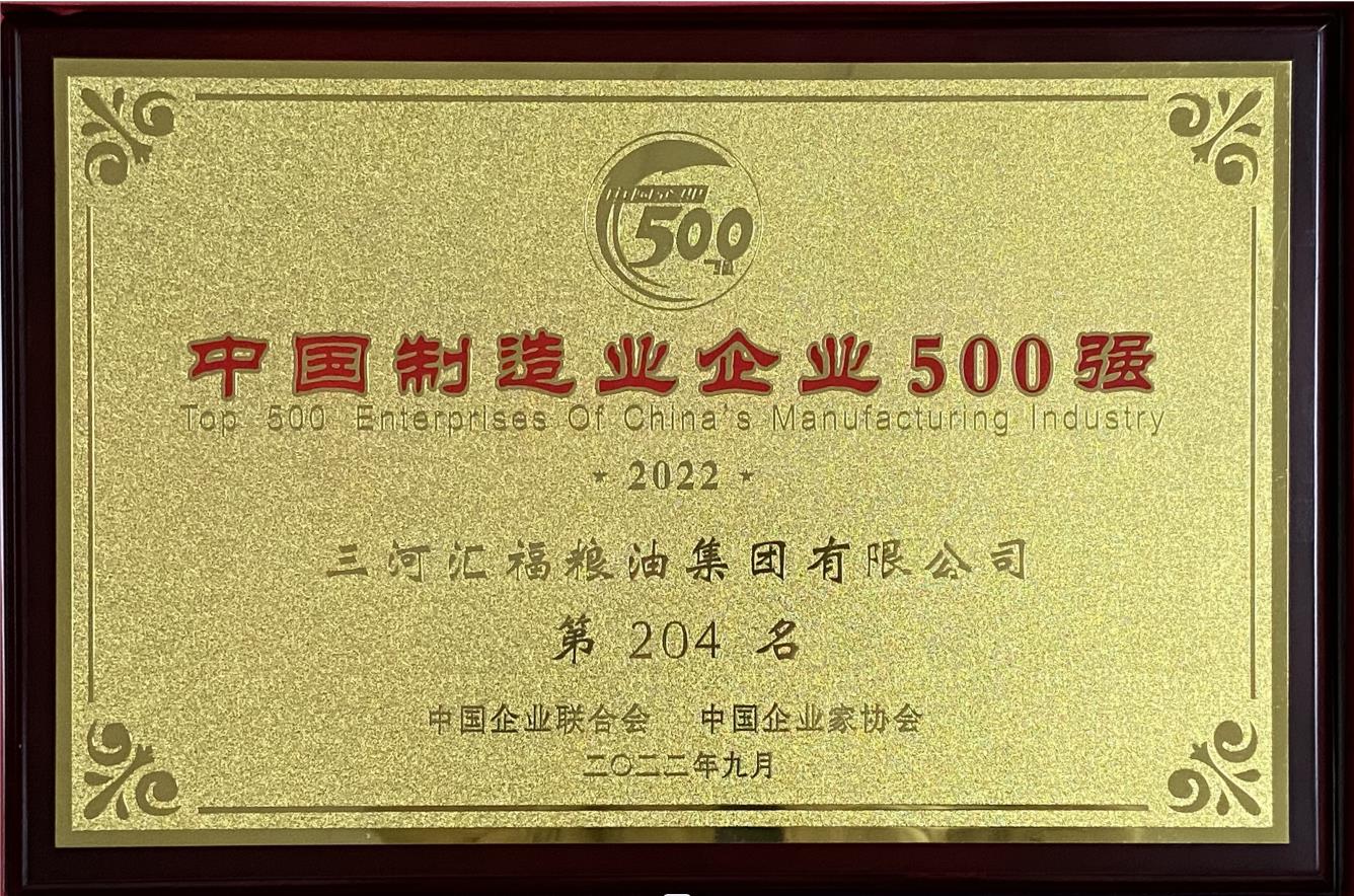 汇福粮油集团荣登2022年中国企业500强、中国制造业企业500强