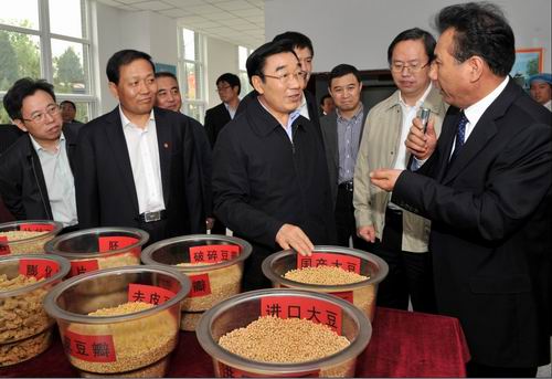 石总在样品展台旁向张书记汇报国产大豆与进口大豆对比情况