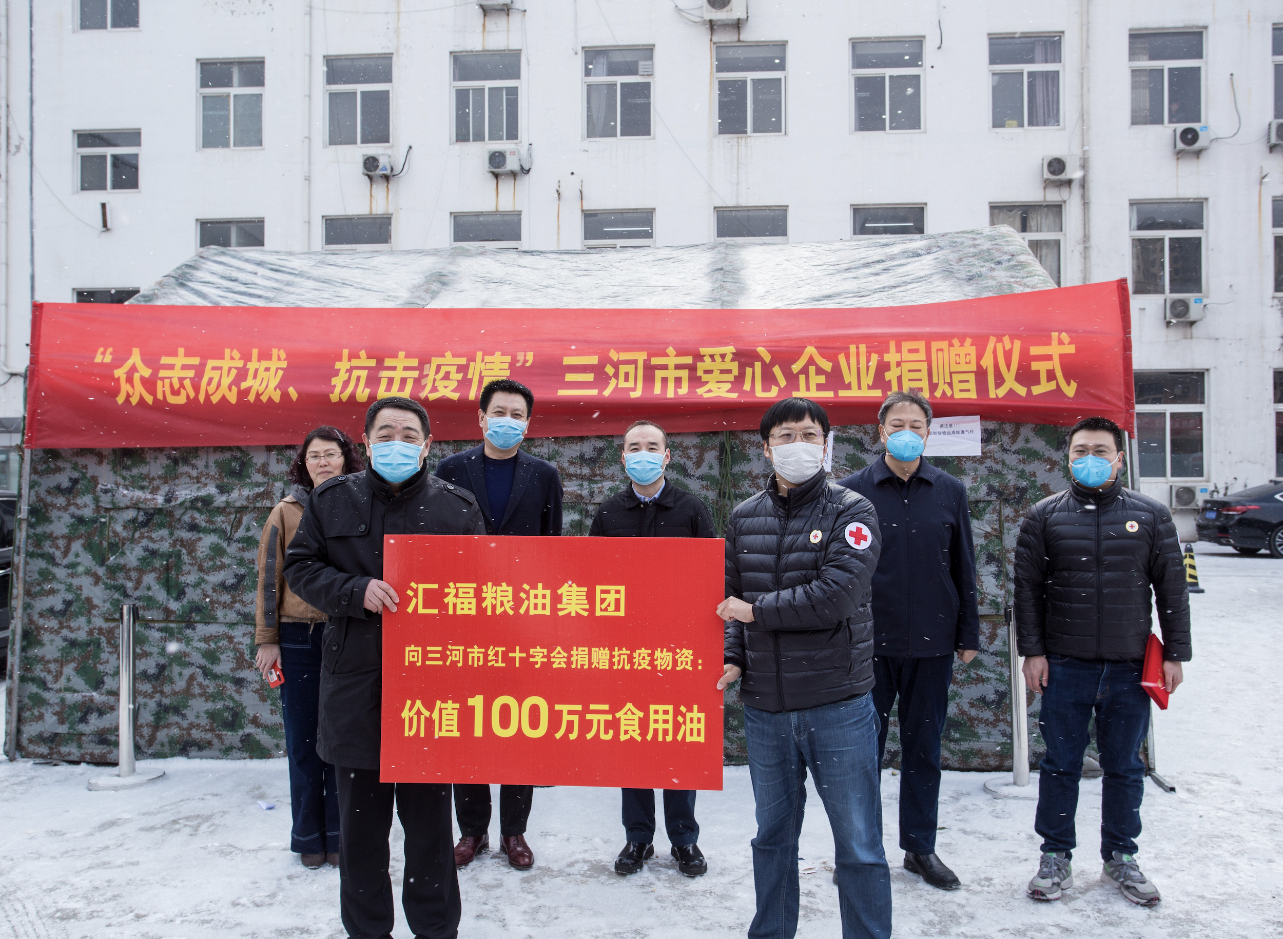 2020年2月5日,零下四度,汇福粮油集团员工冒着严寒和飘雪装运捐赠物资。通过三河市红十字会捐赠5400箱价值100万元食用油。2月6号,汇福粮油集团再向三河市红十字会捐款500万元人民币,支援三河市新型冠状病毒感染的肺炎疫情防控工作。同时,汇福粮油集团江苏泰州工厂也向当地红十字会捐赠物资价值100万元食用油。